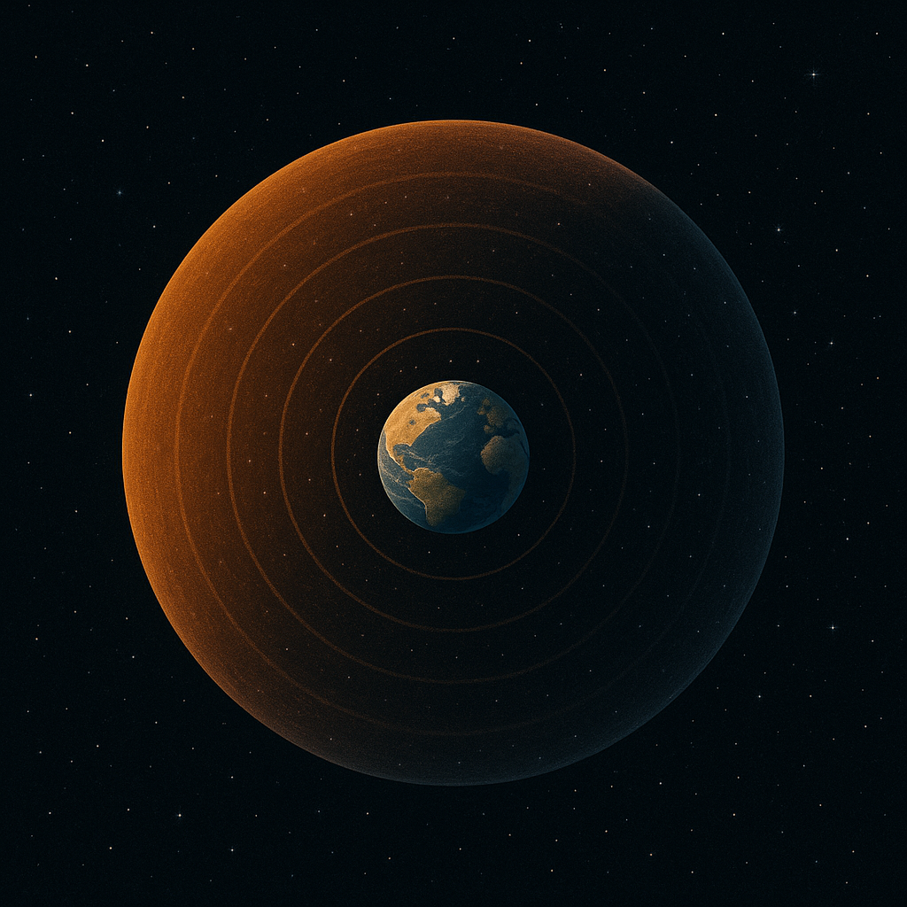 ※ 아래는 ‘지구에서 퍼져나가는 라디오·TV 전파가 수십 광년 규모의 구체(라디오 버블)를 만든다’는 아이디어를 단순화한 이미지입니다.