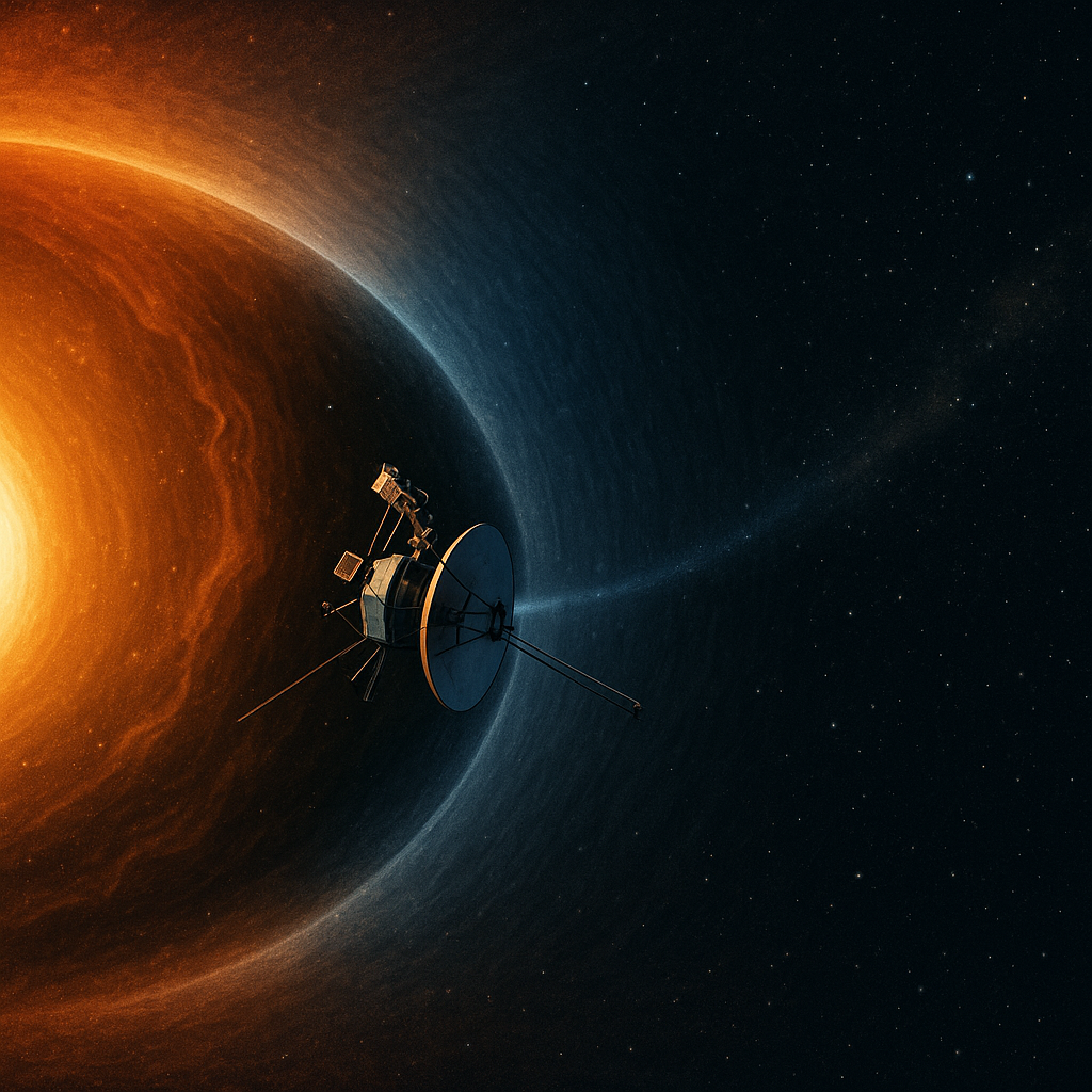 ※ 아래는 ‘태양계 가장자리에서 태양풍 경계(헬리오포즈)를 넘어 항성간 공간으로 진입하는 탐사선’을 개념적으로 표현한 이미지입니다.