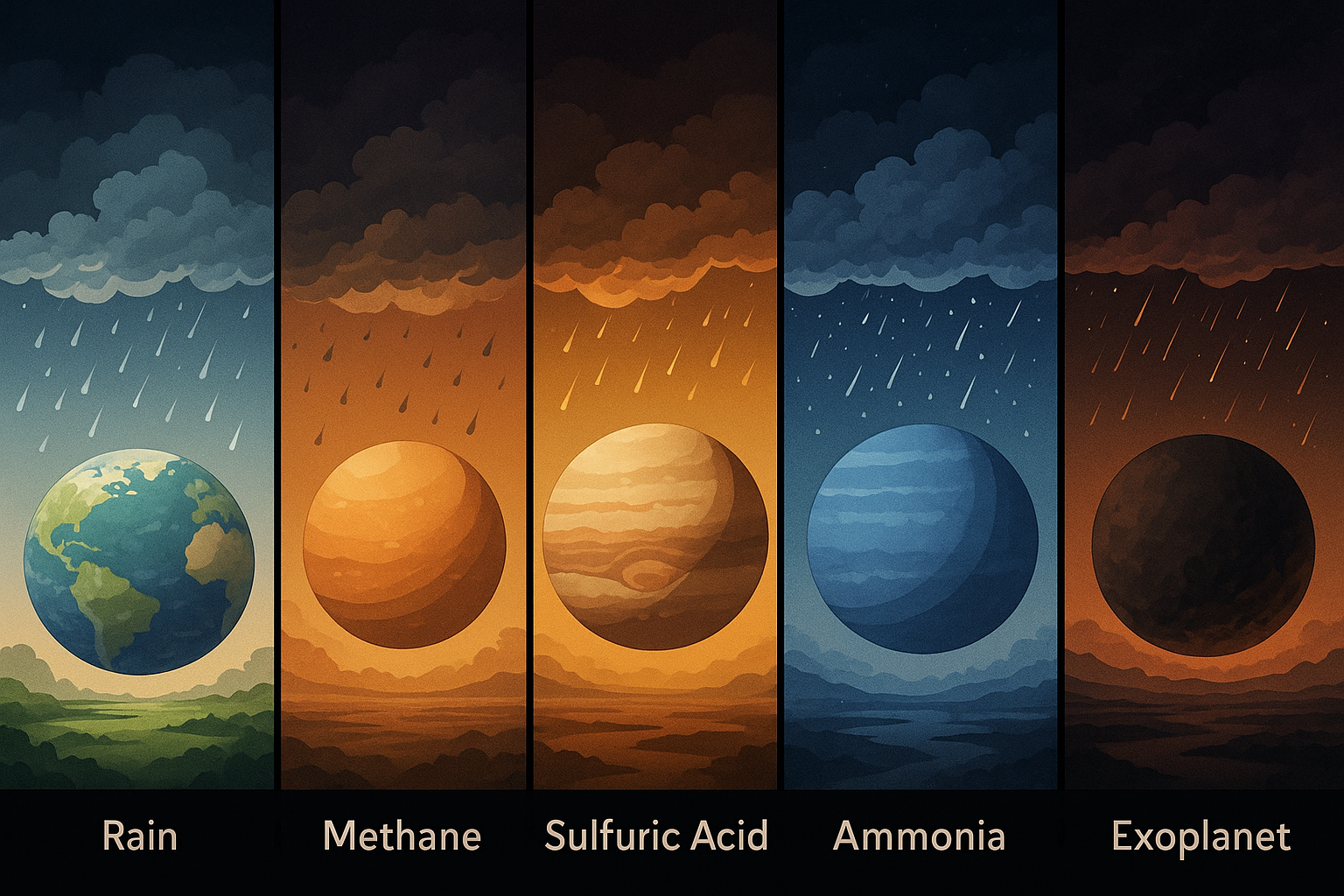 ※ 아래는 ‘지구·행성·외계행성의 다양한 강수 유형(물·메탄·황산·암모니아·다이아몬드·금속)’을 한눈에 대비해 표현한 이미지입니다.