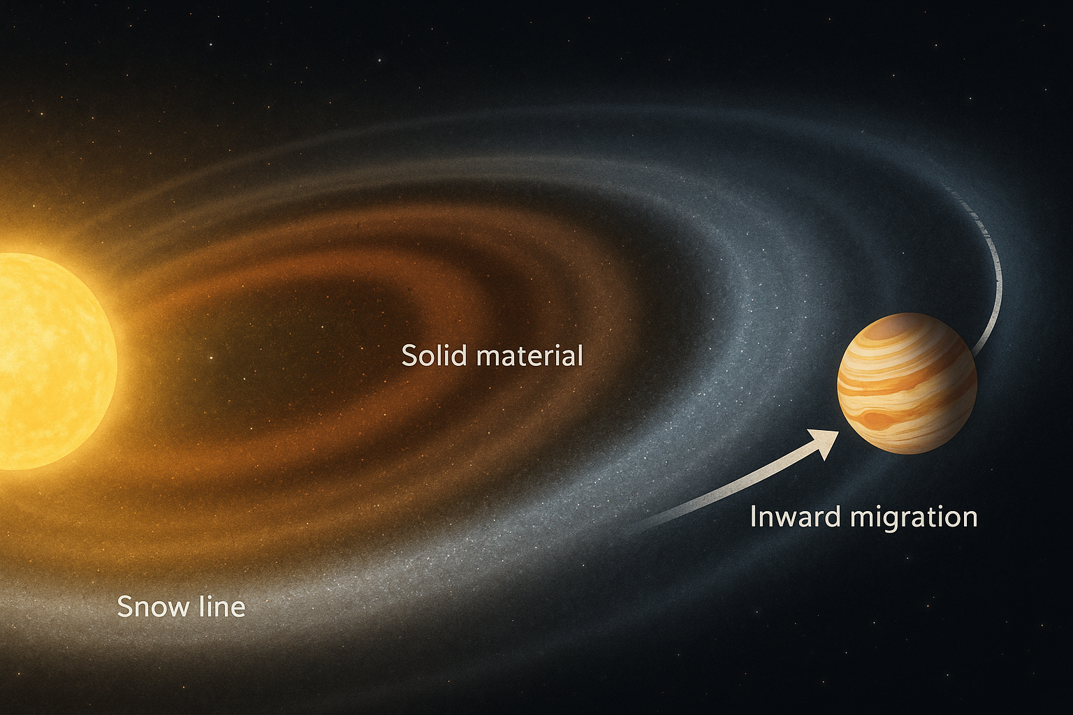 ※ 아래는 ‘항성·원시 원반·눈선 바깥에서 형성된 거대행성이 안쪽으로 이동하며 내측 고체 물질 분포를 재배치하는 과정’을 개념적으로 보여 주는 이미지입니다.