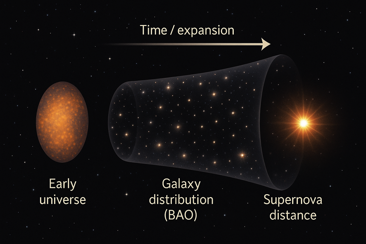 ※ 아래는 ‘초기 우주(배경복사)→은하 분포(BAO)→초신성 거리’가 하나의 우주 시간표로 연결되는 흐름’을 개념적으로 표현한 이미지입니다.
