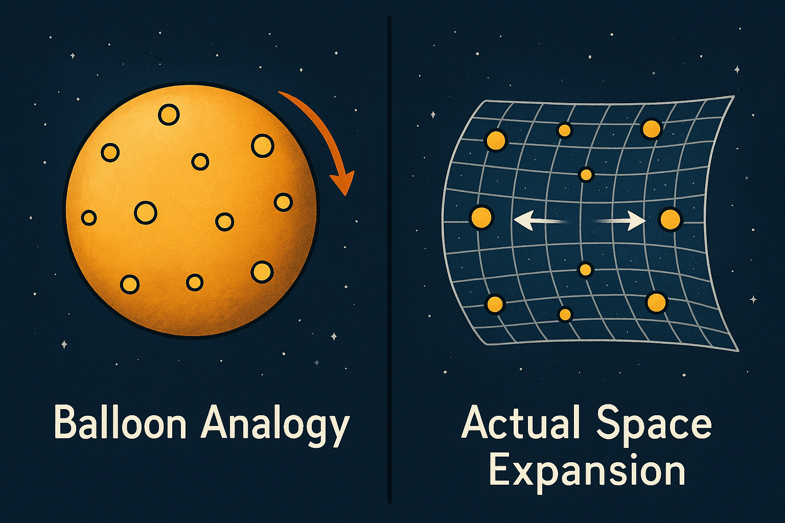 ※ 아래는 ‘풍선 비유와 실제 공간 팽창의 차이(점은 움직이지 않고 공간이 늘어남)’를 개념적으로 표현한 이미지입니다.
