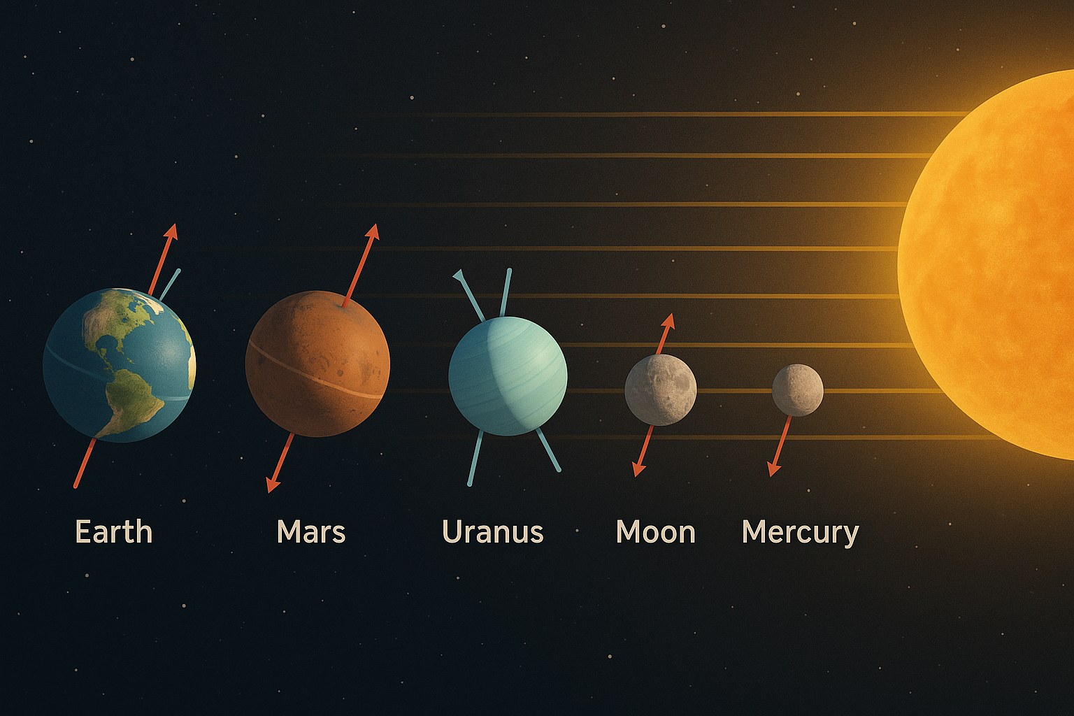 ※ 아래는 행성별 자전축 기울기와 태양 고도 변화를 개념적으로 표현한 이미지입니다.
