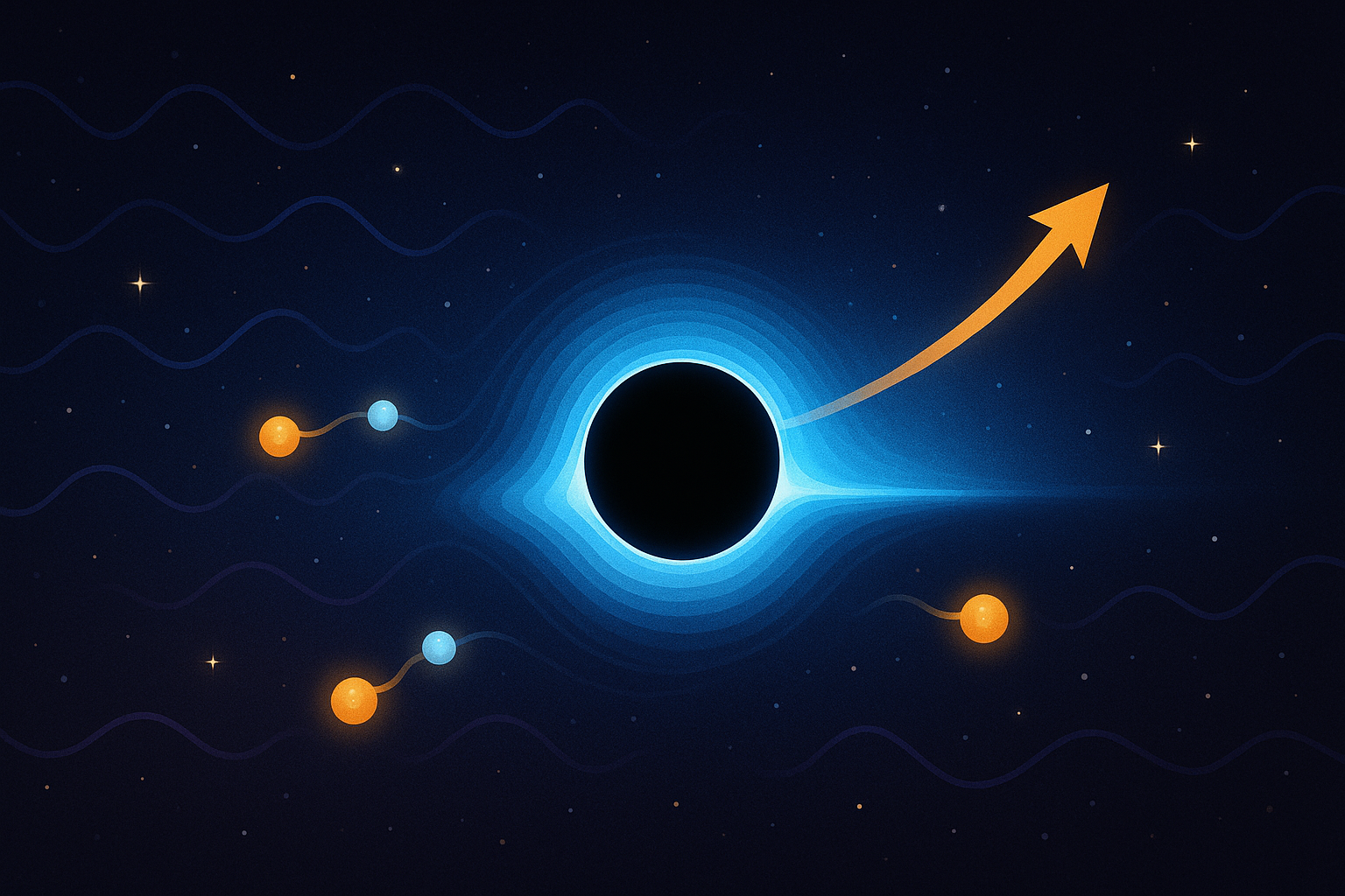 양자장론에서는 완전한 공백도 끊임없이 출렁입니다. 아주 짧은 시간 동안 입자와 반입자 쌍이 나타났다 사라지는 양자요동이 허용됩니다. 사건지평선 근처에서는 이 출렁임이 경계에 의해 비대칭적으로 보일 수 있습니다. “쌍 중 하나가 블랙홀 안쪽으로, 다른 하나가 바깥으로”라는 유명한 설명은 이 효과를 설명하는 교육용 비유입니다.