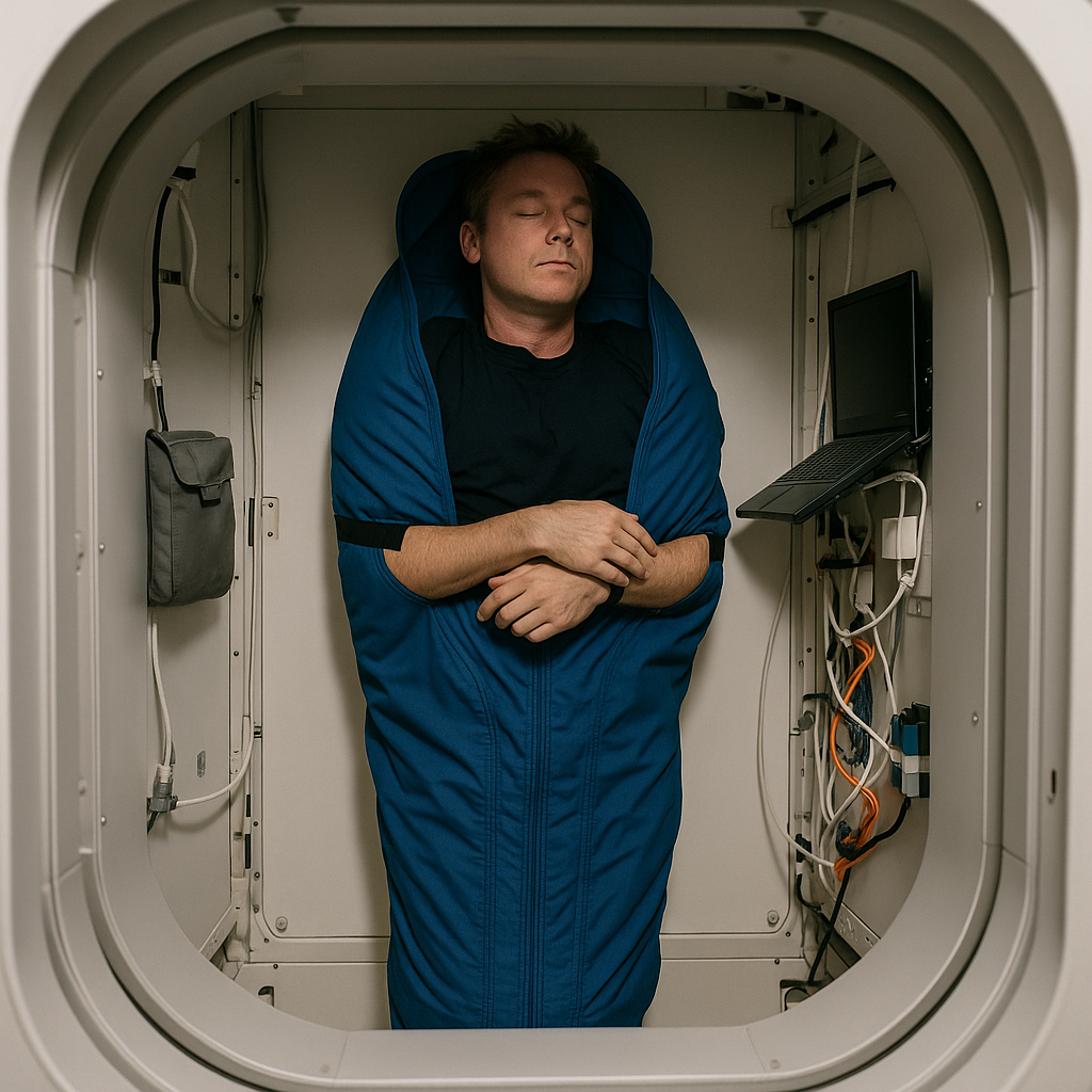 대신 우주인들은 벽에 부착된 작은 ‘수면 캡슐’이나 ‘수면백(Sleeping Bag)’ 안에 들어가 몸을 고정한 뒤 잠을 잡니다. 수면백은 몸이 둥둥 떠다니지 않도록 끈이나 벨크로로 벽, 바닥, 천장에 고정되어 있으며, 내부는 매우 좁고 간소하게 구성되어 있습니다.