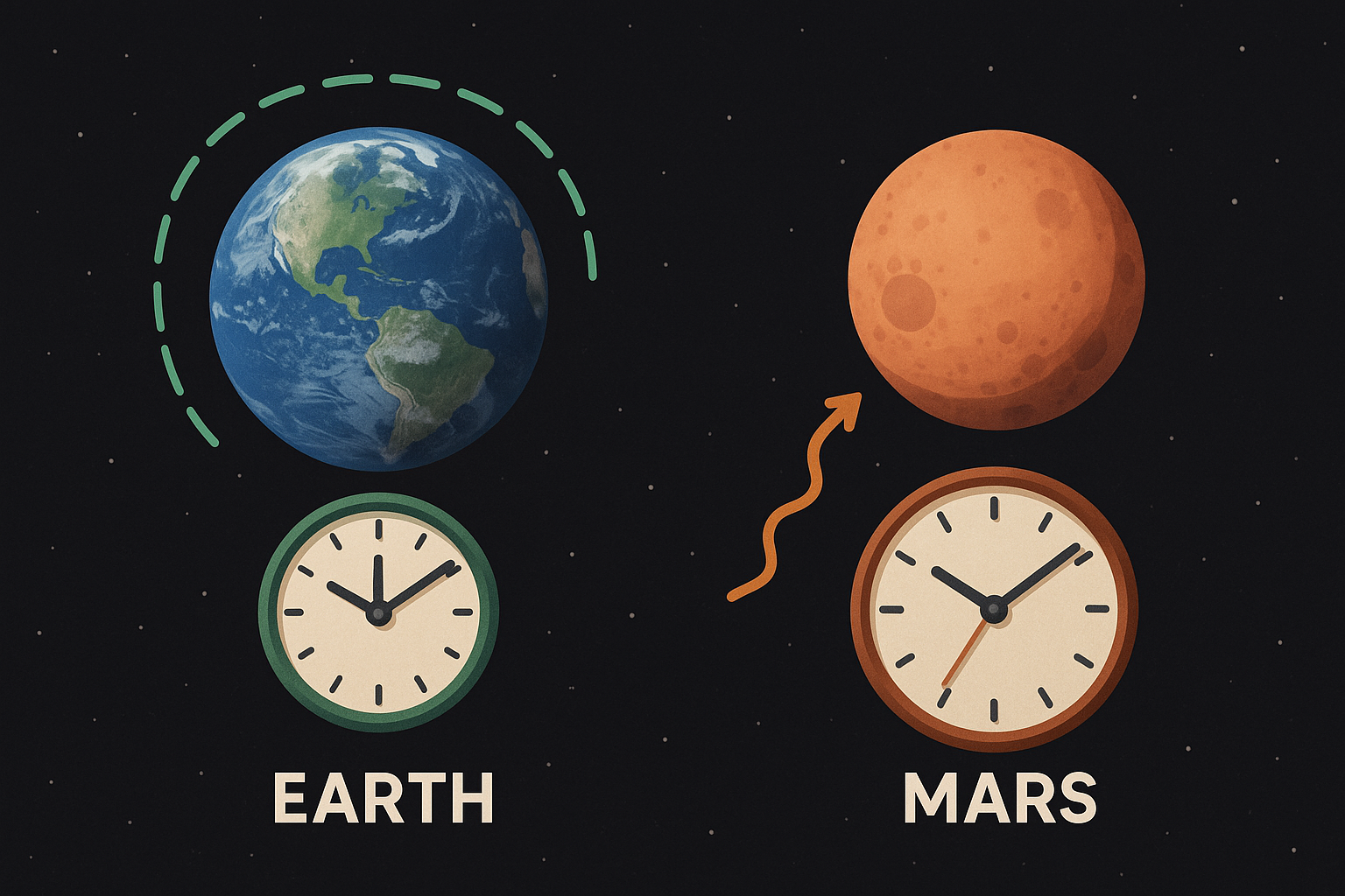 ※ 아래는 ‘지구·화성 시간 비교(솔 길이 + 상대론적 시간 지연)’를 개념적으로 표현한 16:9 삽화 이미지입니다.