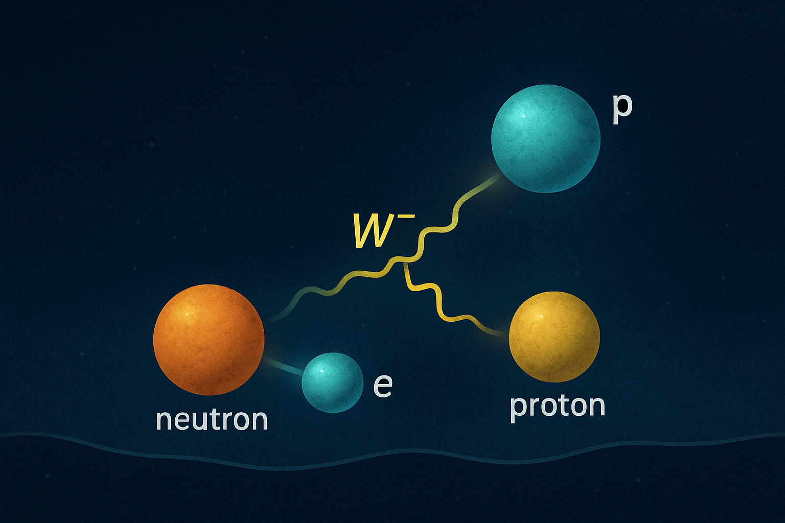 ※ 아래는 베타 붕괴에서 전자·중성미자와 함께 W 보손이 매개되는 과정을 개념적으로 표현한 이미지입니다.