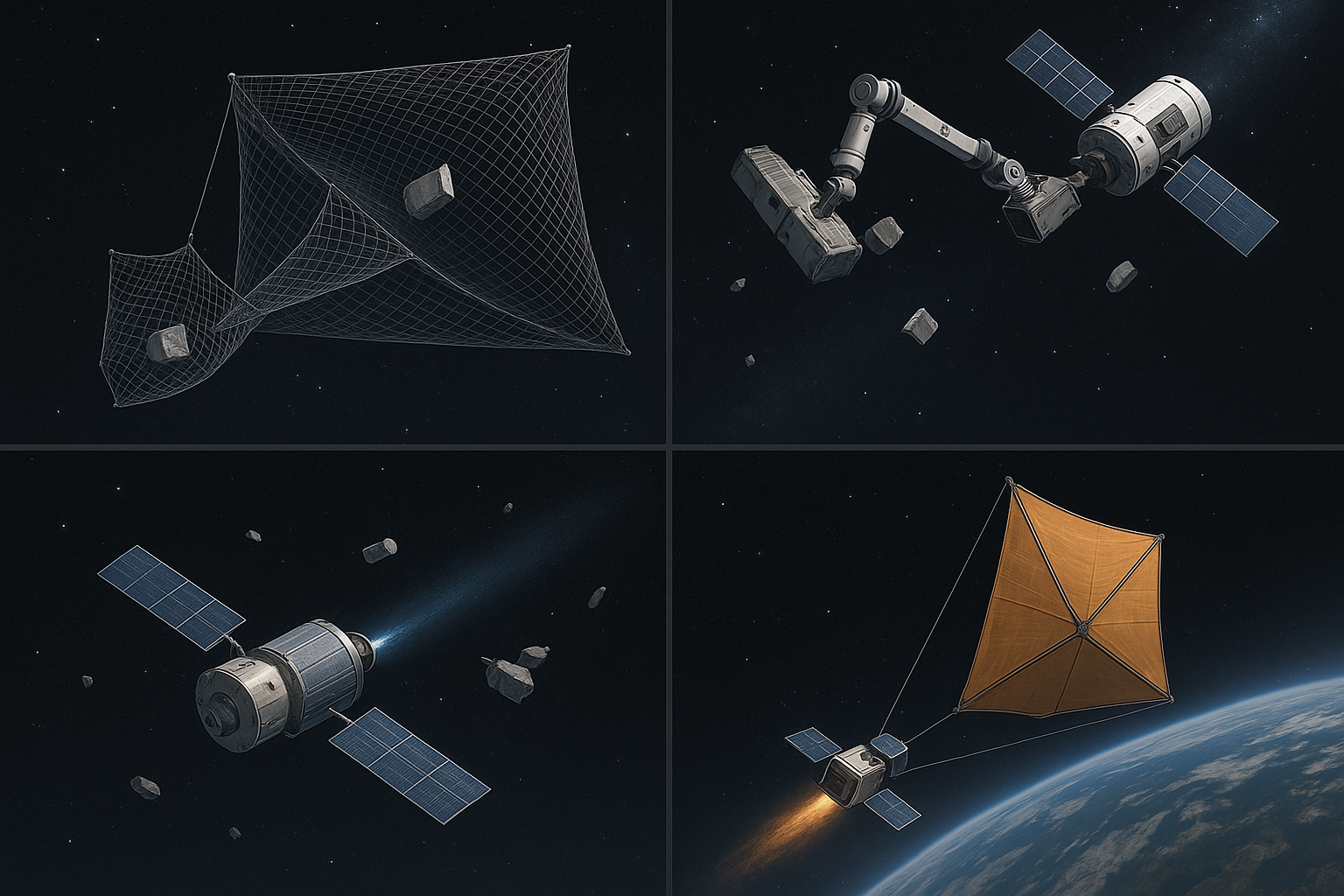 ※ 아래는 ‘LEO에서 잔해 포획(네트·로봇팔)과 비접촉 견인(이온빔·테더), 드래그세일 재진입’을 단계별로 보여 주는 이미지 입니다.